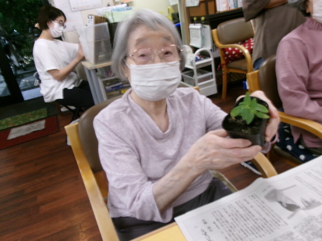 さかのぼる事約3カ月、地域の小学校で行われた苗の譲渡会で頂いた朝顔なんです。小雨の中でしたが、たくさんの方が並んでいらっしゃって、和やかな雰囲気の中で苗を受け取ることができました。ご利用者様だけでなく職員にとっても地域の方々やお子様と触れ合える素敵な機会となりました。